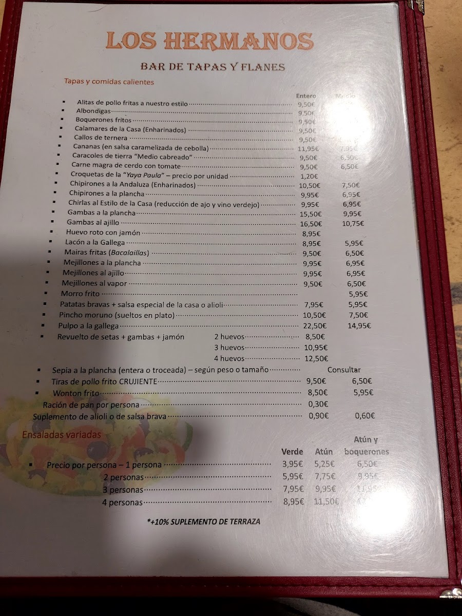 The menu at Bar Los Hermanos features a variety of traditional tapas and bar-style dishes, reflecting the local cuisine of Tarragona. It is structured to offer a selection of small plates, including classic tapas such as Bravas con Salsa de la Casa, Ensaladilla Rusa, Montaditos, and regional specialties like Morro Frito and Chipirones a la Andaluza. In addition to these tapas, the menu includes heartier dishes like Preparación de Callos and Carne en Salsa de Tomate, providing options suitable for a light meal or a more substantial snack.